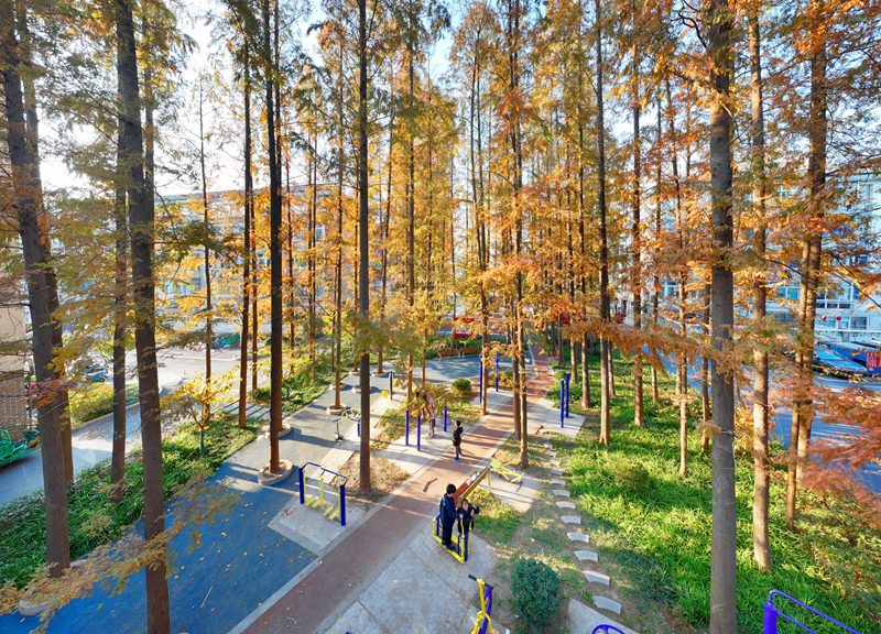 2023年12月3日在崇川區(qū)唐閘鎮(zhèn)街道拍攝的老小區(qū)公園二村里美麗的水杉林。經(jīng)過(guò)老舊小區(qū)改造,近2000平方米的水杉林成為受居民歡迎的文化休閑小公園。