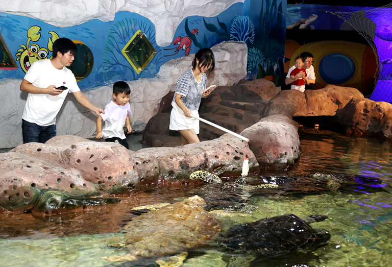 盛夏季節(jié),海底世界內(nèi)的大多數(shù)動物朋友處于“養(yǎng)尊處優(yōu)”的狀態(tài),最忙碌的當屬海豹、海獅,因為它們是南通海底世界的表演明星。此時,海豹表演正在精彩進行中,前來觀賞的游客將看臺擠得滿滿當當。飼養(yǎng)員毛微華說,海豹、海獅雖然怕熱,但暑期是旅游旺季,7月以來每天表演場次從以往的3場增加到4場。“入夏以來,海豹、海獅的飲食量有些下降,以往一天三頓吃6.3—7.5公斤的青占魚、青魚,目前調(diào)低到5.4公斤,食物以青占魚為主,另外加一些小黃魚,以豐富它們的營養(yǎng)元素?!笨蹬握f。