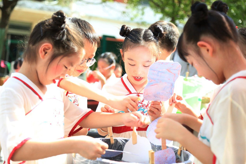 發(fā)布時(shí)間:2024-09-14 編輯:王婷 來源:視覺南通網(wǎng)結(jié)合賓山小學(xué)獨(dú)特場域,游園會(huì)分為四個(gè)篇章。除飛花令外,在桂樹林中,孩子們猜燈謎、講故事?;虼┧笤跓糁i條幅間“碰碰運(yùn)氣”,或駐足在造型各異的燈籠前細(xì)細(xì)欣賞,猜中謎底的幸運(yùn)兒忙著領(lǐng)取月餅、桂花糕等獎(jiǎng)品,和小伙伴們一同分享甜蜜。荷花池畔,孩子們繪漆扇、作書法。他們身著漢服,宛若穿越時(shí)空而來的小書生和小仕女,有的手執(zhí)彩紙,上下翻飛,活靈活現(xiàn)的圖案躍然紙上;有的調(diào)配色彩,旋轉(zhuǎn)扇面,一幅幅漆扇出水而成,千變?nèi)f化;有的氣定神閑,筆下生風(fēng),一筆一劃間盡顯漢字之美。三角楓下,孩子們更是大顯身手,一展才藝。古箏齊奏《彩云追月》、小合唱《客家細(xì)妹采茶歌》、朗誦《水調(diào)歌頭》、舞蹈《只此青綠》等節(jié)目輪番亮相,孩子們指尖跳躍、歌聲嘹亮、舞姿動(dòng)人,在一顰一笑、一舉一動(dòng)間讓詩意綻放校園,共話團(tuán)圓中秋。