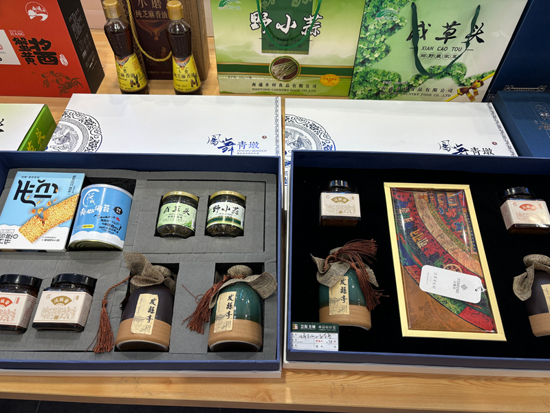 再往里走,“江海叢山共”刺繡桌旗、南通仿真繡《南通博物苑》、茶禮組合等各式產(chǎn)品,集仿真繡和蘆菲花布于一體,讓非遺更好地融入大眾生活。