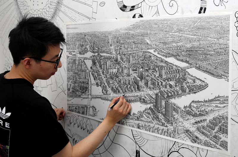 朱佳介紹,針管筆是繪制圖紙的基本工具之一,能繪制出均勻一致,且細(xì)膩的線條,畫出更多的細(xì)節(jié),“用彩色鉛筆上色,相當(dāng)于進(jìn)行了二次藝術(shù)創(chuàng)作,細(xì)節(jié)更飽滿,部分網(wǎng)友更喜歡彩色版本的畫作?!?/p>