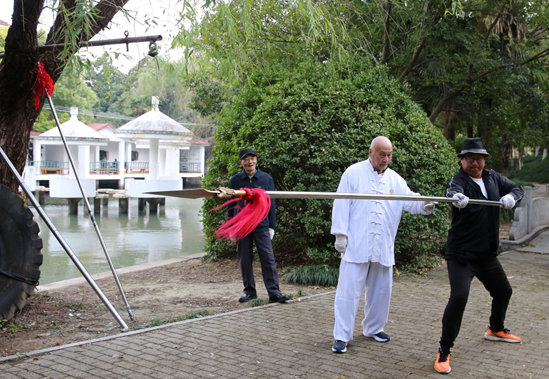 20世紀(jì)80年代初期,朱劍杰訂閱《武林》雜志,看到太極名家李雅軒的介紹,第一次接觸到太極大槍的招數(shù)。太極大槍又名太極大桿、太極十三槍,是太極門中獨(dú)特的長兵器,其重量是一般外家槍桿的三倍,由于它又長又重,沒有較深厚的太極拳功夫不易掌握,故歷來傳習(xí)不廣。朱劍杰苦練太極多年,11年前才真正練習(xí)太極大槍。這桿大槍長3.1米、重5公斤,不銹鋼材質(zhì)。