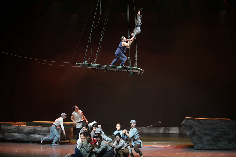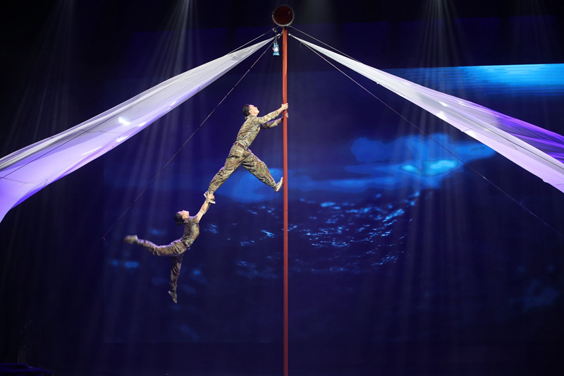 整場演出在雜技《水鄉(xiāng)奇兵—秋千蹦床跳板》中拉開帷幕。演員們借助秋千、蹦床和跳板,完成翻騰、拋接、疊羅漢等一系列高難度動作,將觀眾帶入那段烽火連天的歲月,感受戰(zhàn)士們英勇無畏的精神氣概。緊接著,雜技節(jié)目《逆行者·梯》運用“晃梯”“轎子”兩種技巧,重構火場生死圖景,將雜技之險淬煉為對消防戰(zhàn)士的深情禮贊;雜技《凌風——爬桿》通過一連串的桿上技巧,講述了王繼才、王仕花夫婦守島衛(wèi)國的動人事跡;雜技《草原魂·頂》融合了千年頂功技藝與草原文化精髓,再現(xiàn)草原勇士的堅貞勇敢、自由奔放;木偶表演《偶趣盎然》通過技藝與趣味相結合的方式,展現(xiàn)出揚州杖頭木偶的獨特藝術魅力;雜技《飛機術》則以不斷旋轉(zhuǎn)、飛揚的飛機板,詮釋“源于生活又高于生活”的雜技藝術,帶領觀眾領略傳統(tǒng)雜技的“新”與“變”。