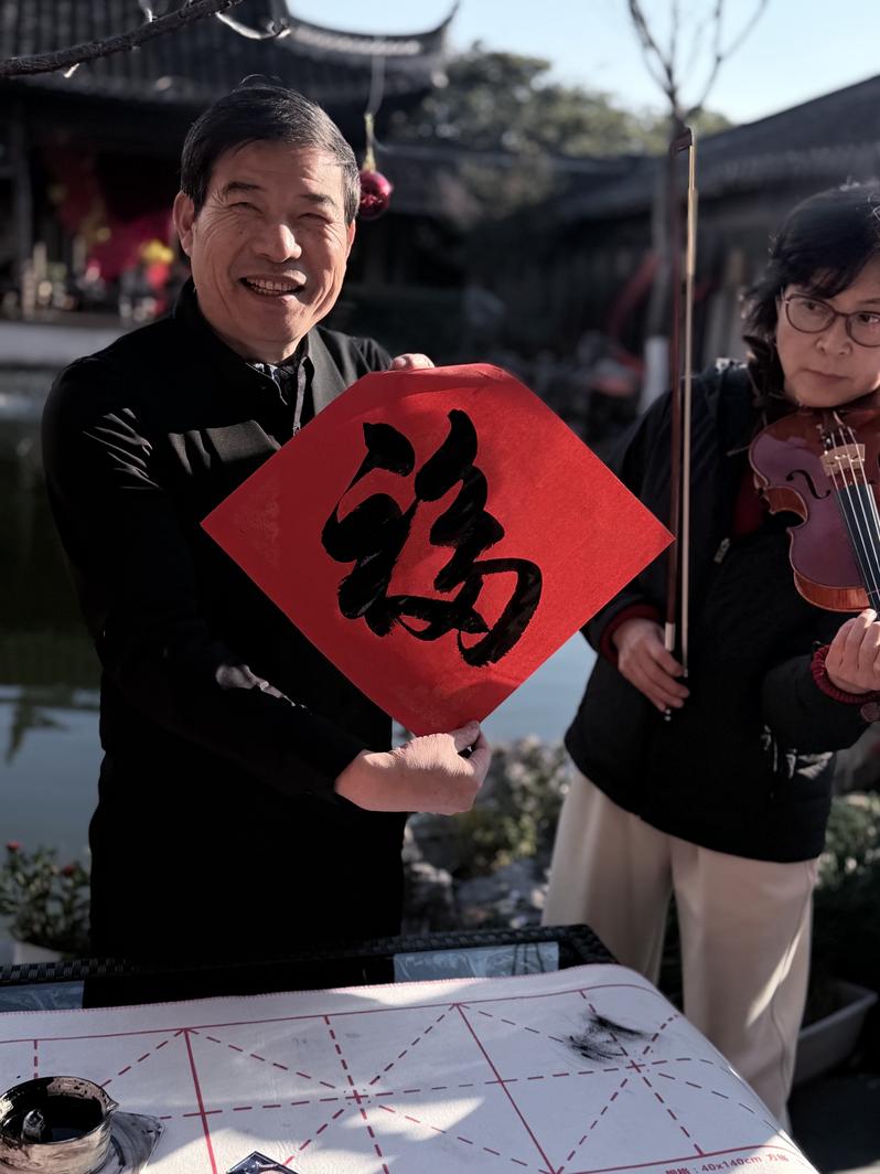 演出間隙的互動環(huán)節(jié)同樣溫情滿滿。老年大學(xué)學(xué)員吳建華現(xiàn)場揮毫潑墨,將一幅幅寓意吉祥的福字贈予觀眾,把濃濃的新春祝福傳遞到每個人心中。