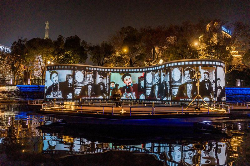 從中公園北側(cè)的直流水幕,到沈繡博物館前的扇形水幕;從和平橋下的彩色光影隧道,到城南別業(yè)百年老墻上的3D Mapping秀……游船漫行,一幅幅流光溢彩的光影畫卷接連映入眼簾。