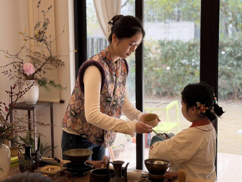 茶香未起,詩意已濃?!皩W茶先學禮?!眹乙患壊杷噹熋蠋煖芈曢_腔。小記者們挺直腰背,將椅子擺正,雙手交疊輕放于茶巾之上?!邦^正、肩平——”跟著指令,一張張小臉格外專注。隨后,老師開始演示宋代點茶的完整流程。備水、凈手、點茶、分茶……茶粉在老師手中逐漸泛起綿密的泡沫,茶香隨之四溢。