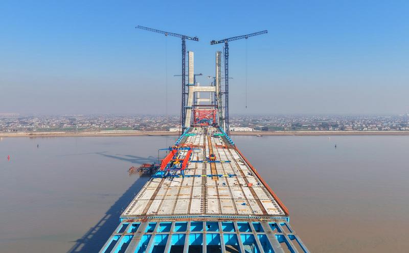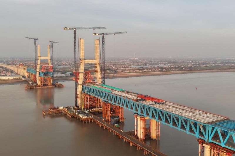 崇啟公鐵長江大橋是上海至南京至合肥高鐵控制性節(jié)點(diǎn)工程,全長4.09公里,橫跨長江入??诒敝Ш降?。其構(gòu)造為雙層布置的公鐵兩用橋,上層為雙向6車道、時(shí)速100公里的一級公路,下層為時(shí)速350公里的雙線高速鐵路+時(shí)速250公里的雙線城際鐵路。其中主通航孔橋?yàn)橹骺?00米雙塔雙索面鋼桁結(jié)合梁斜拉橋,是世界最大跨度雙塔雙索面公鐵兩用無砟軌道斜拉橋。